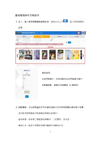 圖書薦購操作流程說明 1. 登入:進入愛閱讀圖書館薦購系統,請先由右上方 ,登入您的帳號及 密碼 。 畫面說明: ※熱門關鍵字:抓取博客來的熱門關鍵字顯示。 ※薦購總覽:隨機抓取薦購檔 32 筆資料。 2. 網路薦購:可由網路書店不同的資料查詢方式找到想推薦的資料進行推薦, 並針對目前館藏或已有推薦記錄做比對提示。 查詢來源:目前有三種選項為博客來、三民書局、金石堂。 查詢方式:依各不同資料來源可選擇不同查詢方式。 2