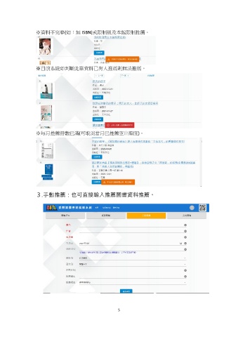 ※資料不完整(如:無 ISBN)或限制級及本館限制推薦。 ※目前系統如判斷此筆資料已有人推薦則無法推薦。 ※每月推薦冊數已滿(可取消當月已推薦空出額度)。 3. 手動推薦:也可直接輸入推薦圖書資料推薦。 5